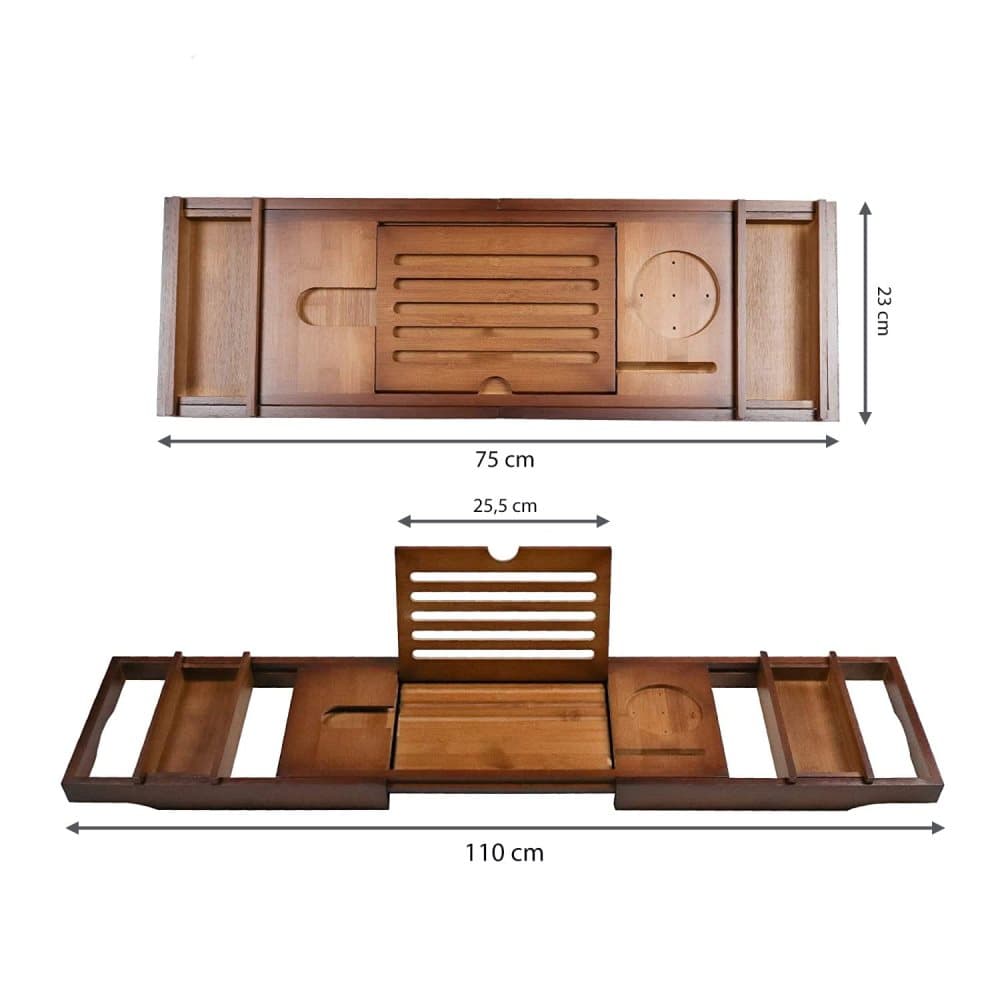 Ekologisesta bambusta valmistettu kylpyammeteline on paitsi tyylikäs myös erittäin mukautuva. Teleskooppirakenteensa ansiosta sitä voi pidentää 75 cm:stä 110 cm:iin, joten se sopii täydellisesti useimpiin tavallisiin kylpyammeisiin viemättä liikaa tilaa.