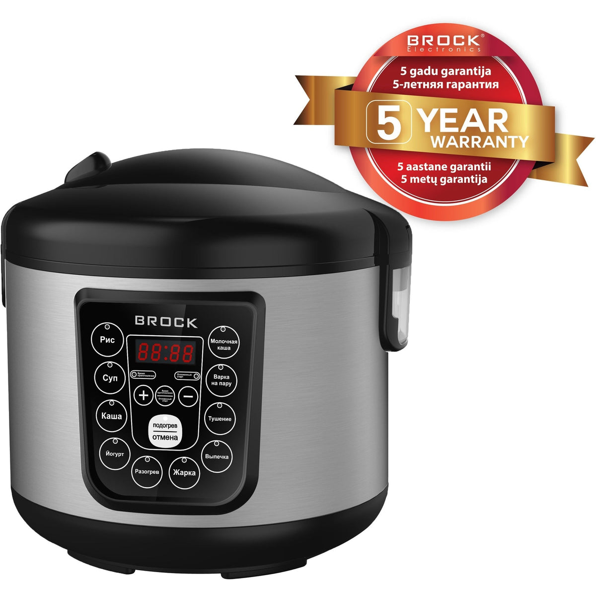 Brock MC 1003:ssa on kestävä ruostumattomasta teräksestä ja muovista valmistettu kotelo, joka takaa pitkän käyttöiän. Lämpimänäpitotoiminto aktivoituu automaattisesti kypsennyksen jälkeen ja pitää ruoan täydellisessä lämpötilassa, kunnes olet valmis tarjoiluun.