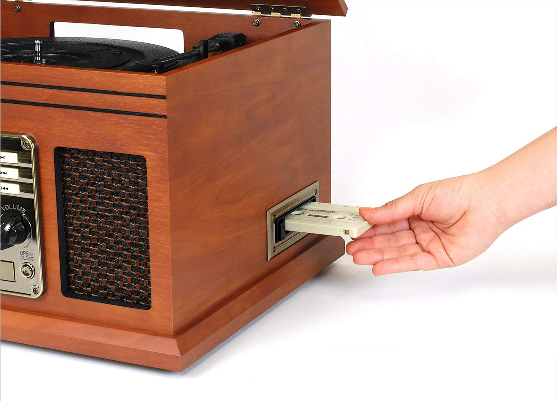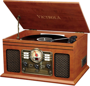 Victrola VTA-200BT on monipuolinen 6-in-1-stereojärjestelmä, joka yhdistää klassisen levysoittimen moderneihin ominaisuuksiin, kuten Bluetoothiin, CD-soittimeen, kasettisoittimeen ja FM-radioon, kaikki tyylikkäässä puukotelossa.