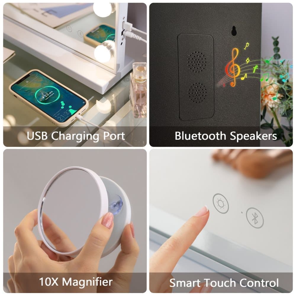 Ensisijaisen tehtävänsä lisäksi tämä monipuolinen peili yhdistää modernia teknologiaa, joka parantaa käyttökokemustasi. Sisäänrakennetun Bluetooth-kaiuttimen avulla voit suoratoistaa suosikkimusiikkiasi tai -podcastejasi valmistautuessasi, mikä muuttaa meikkipöytäsi henkilökohtaiseksi viihdekeskukseksi.