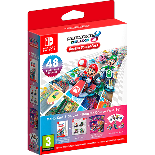 - Sisältää Mario Kart 8 Deluxe - Booster Course Pass -latauskoodin, 4 nastaa, 5 taidekorttia ja 10 tarraa