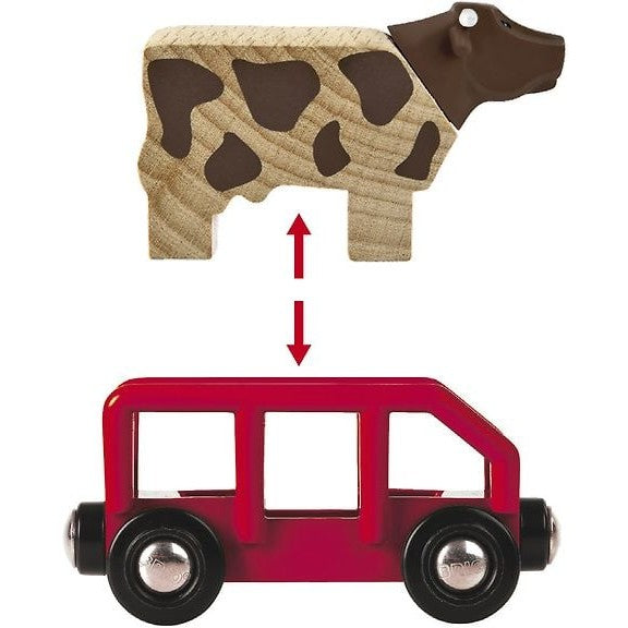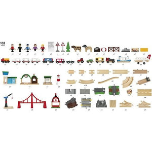 - Includes various BRIO Railway track sections, special pieces, figures, and animals