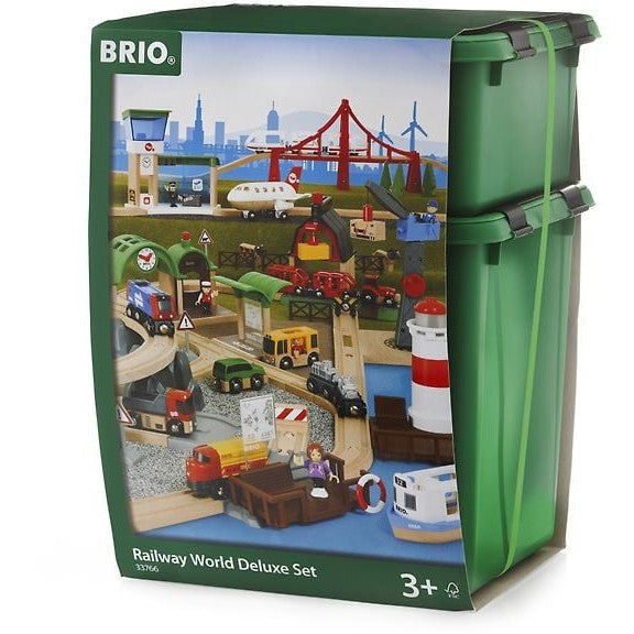 The BRIO 33766 Deluxe Railway World is an irresistible collection of the finest railway pieces, bringing together all your favorite wooden railway elements into one complete package. This expansive set allows classic tracks and trains to journey through diverse environments, including a bustling harbor, a lively airport, a talking railway station, and a charming farm.
