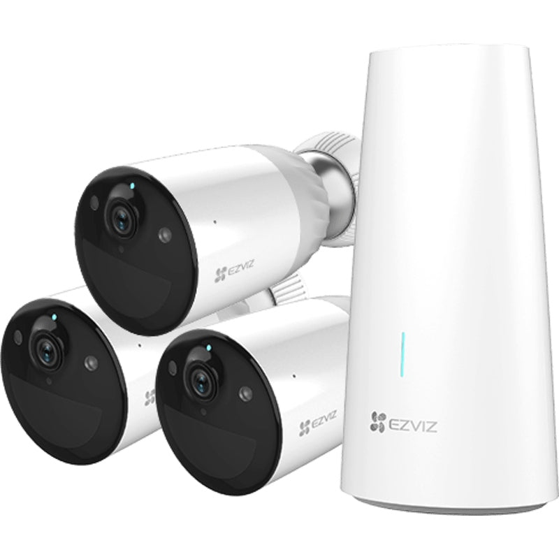 The EZVIZ BC1-B3 security camera package provides comprehensive monitoring for your home, every hour of the day. It includes a base station and three wireless BC1 cameras with color night vision, two-way audio, and an active alarm mode. The system's battery power lasts for up to a full year on a single charge. Installation and use are extremely easy with the English-language mobile app.