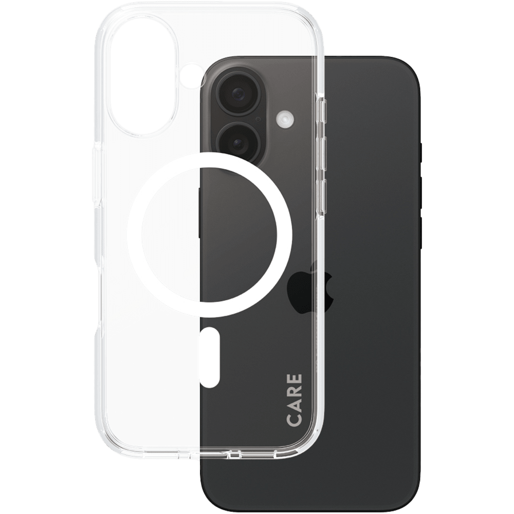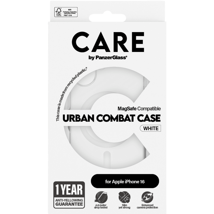 The Panzer Care Case Urban CB White MagSafe for iPhone 16 offers exceptional protection, featuring MagSafe compatibility and proven durability from 4.8-meter drop tests. Crafted from 100% recycled clear plastic, it comes with a one-year anti-yellowing guarantee.