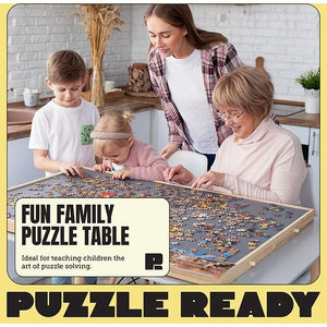 Designed to accommodate 1000-piece puzzles, the work surface measures approximately 61 x 76 cm, providing ample space for most standard-sized puzzles. The wooden construction ensures durability and stability, while the non-slip feet at the corners of the board prevent it from sliding on smooth surfaces.