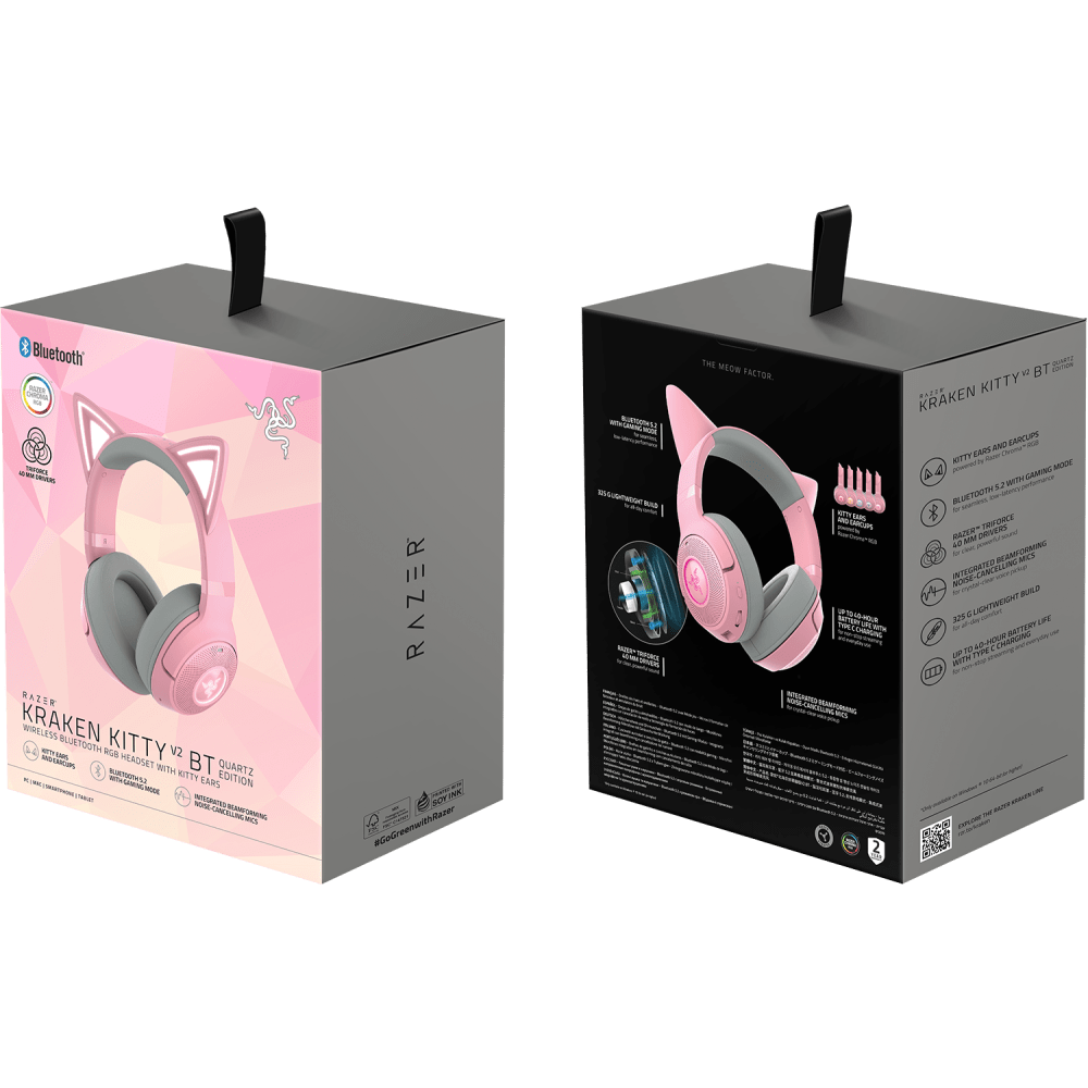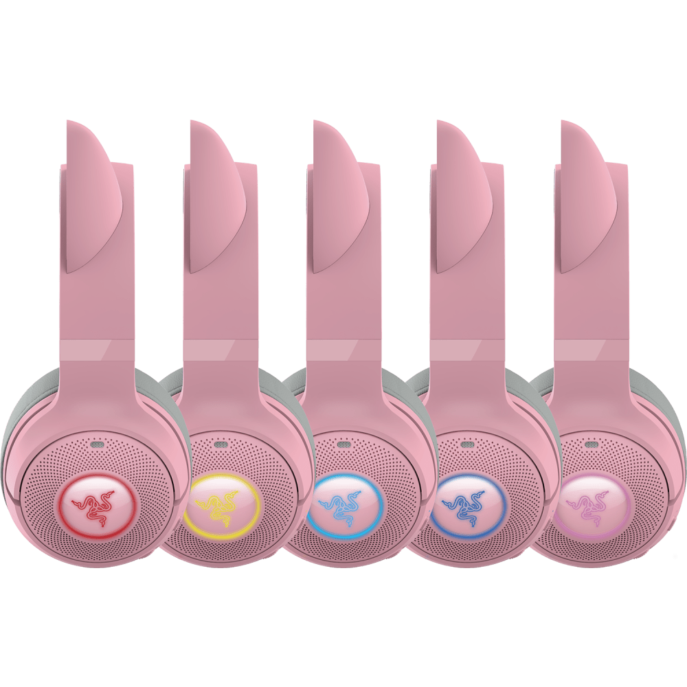 Unleash your unique style with the Razer Kraken Kitty V2 BT Quartz Wireless Gaming Headset. These Bluetooth headphones feature customizable Razer Chroma RGB lighting with 16.8 million colors and effects perfect for both gaming and IRL streaming.