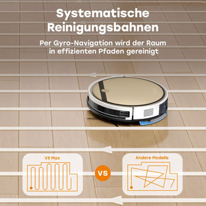 Enjoy extended cleaning sessions with an impressive runtime up to 120 minutes , allowing the V5 Max to cover large areas of up to 120mÂČ on a single charge. When the battery runs low, the robot intelligently pauses its cleaning, returns to its charging station automatically, and resumes cleaning exactly where it left off once recharged, ensuring no spot is missed.