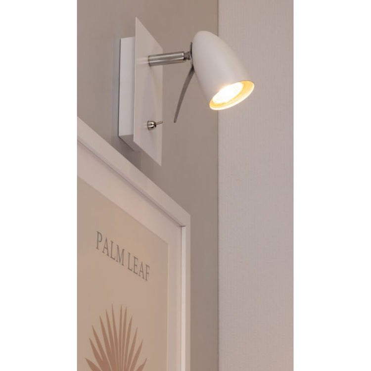 This Spot-Light wall lamp offers a harmonious white finish and minimalist design, perfect for modern interiors. It provides precise and efficient spot lighting with its GU10 socket and 35W maximum power.