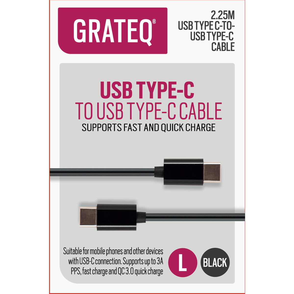 Grateq USB-C till USB-C-kabeln är en mångsidig 2,25 meter lång laddnings- och dataöverföringslösning, med USB-C-kontakter i båda ändar och stöd för olika snabbladdningsprotokoll för universell enhetskompatibilitet.