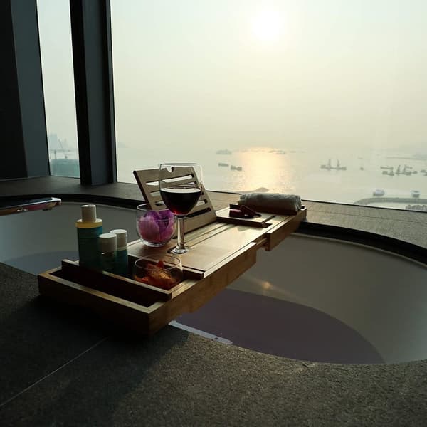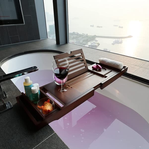 Tänk dig: ditt badkar är klart, brickan är utdragen och du kan njuta av dina favoritprogram på en surfplatta eller fördjupa dig i en spännande bok utan att oroa dig för våta föremål. Med speciella hållare för din surfplatta, bok och till och med ett vinglas förblir allt säkert och torrt. Brickan är justerbar och passar alla badkar upp till 110 cm breda, vilket gör den idealisk för alla badrum.