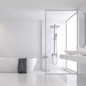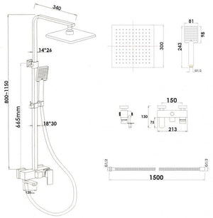Detta duschset i krom har en badkarsblandare med temperaturkontroll, vattenflödesjustering och en omkastare för 30x30 cm regndusch, handdusch och pip. Dess moderna design och slitstarka konstruktion i mässing och rostfritt stål gör det till ett elegant och pålitligt tillskott till alla moderna badrum och passar både duschkabiner och badkar.